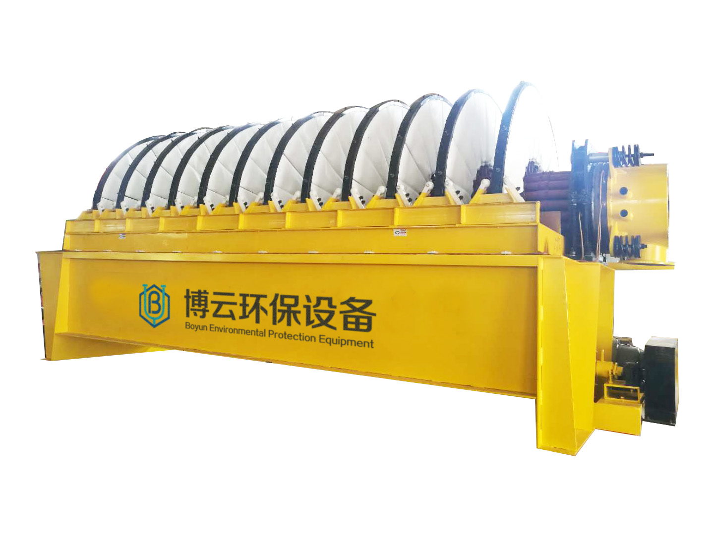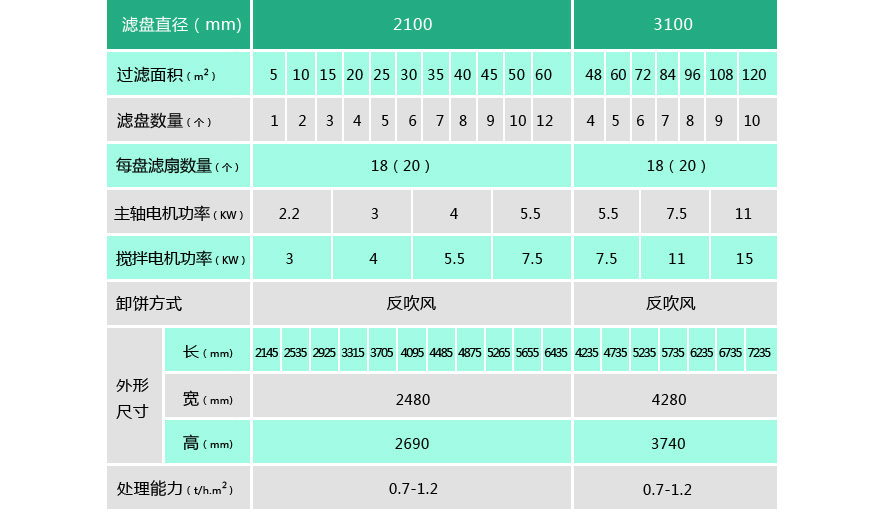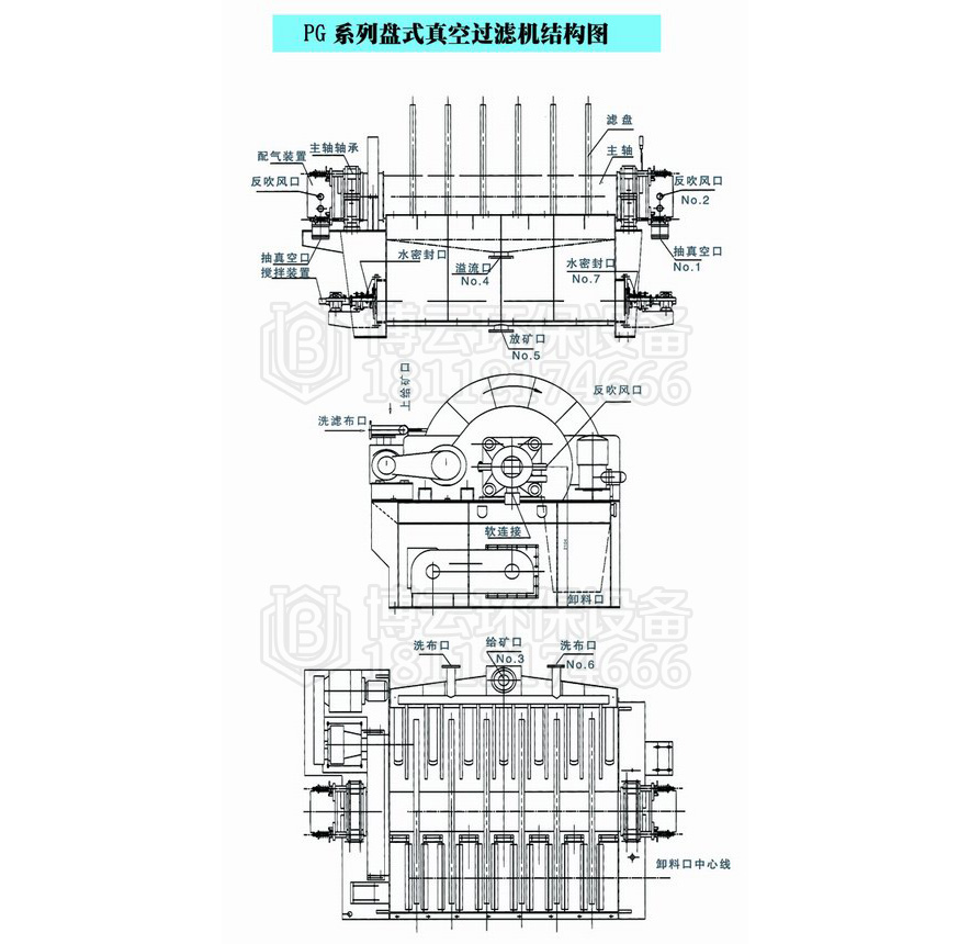 PG系列盤式真空過濾機(jī) (1)扇形濾板脫水孔分布均勻,孔率合理,筋條尺寸大,由高強(qiáng)度工程塑料制成,壽命提高了2-3倍。 (2)濾液管過濾數(shù)面大,分配頭腹腔容積大,提高了抽氣率和濾液排放效果。 (3)耐磨錦綸、單或復(fù)絲濾布使脫餅率高且不易堵塞,使用壽命長。 (4)多點(diǎn)干油泵集中多點(diǎn)自動潤滑。 (5)濾布自動清洗裝置,保持了其良好的脫水效果。 (6)臥式強(qiáng)制高速攪拌、軸端采用橡膠及石墨盤根和水壓差三重密封不漏漿。 (7)主傳動無級變速,依物料的濃度及流量調(diào)節(jié)(交流調(diào)速電機(jī)或變頻器),以求達(dá)到理想的工作效果 。 (8)每盤由20片扇形板組成,加強(qiáng)了過濾過程控制,成餅厚度均勻。 (9)磨擦片采用特制耐磨硼鑄鐵,剛?cè)嵯酀?jì)密封佳,使用壽命達(dá)到十年以上。 (10)濾液管為高強(qiáng)度耐磨陶瓷復(fù)合鋼管,提高壽命10倍以上。 (11)濾液管與濾扇接口去掉下法蘭,采取模具定位直接焊接,減少了90%可能的漏氣點(diǎn)。